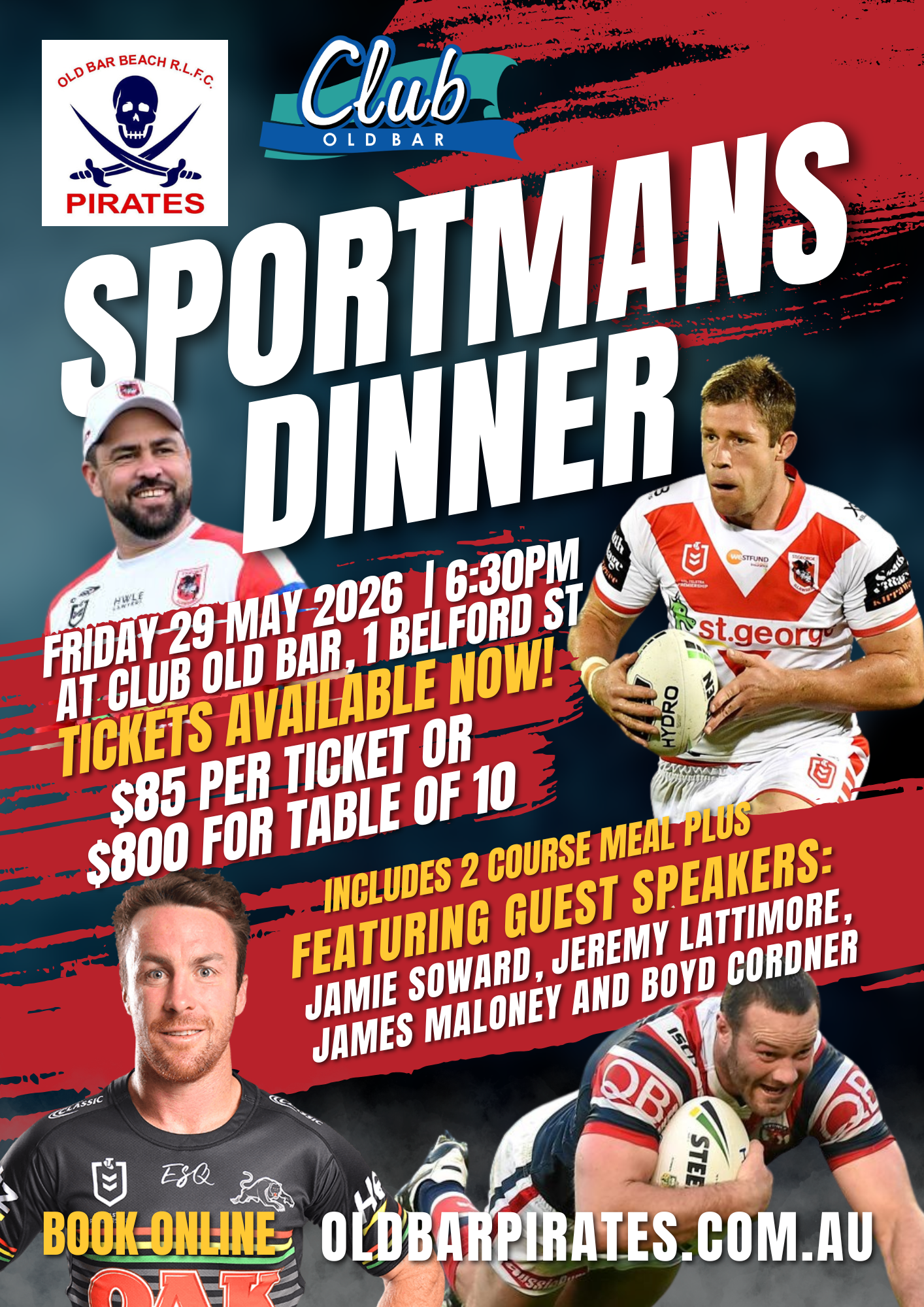Join us for an exciting evening at Club Old Bar on Friday, 29th May, starting at 6:30 PM, for a Sportsman’s Dinner.